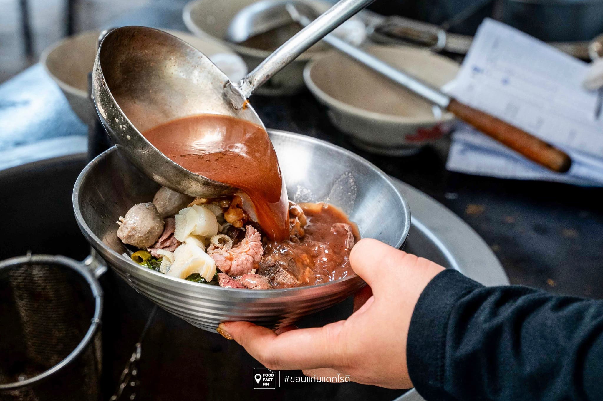 ความพิเศษของ ก๋วยเตี๋ยวเรือ คนวังฯ ไม่ได้มีดีแค่รสชาติจัดจ้านสะใจเท่านั้น แต่ยังมาจากความใส่ใจในทุกชามที่เสิร์ฟเลยครับ ทั้งวัตถุดิบที่คัดมาอย่างดี ทั้งเนื้อสดชิ้นใหญ่ เนื้อตุ๋นหอมละลายในปาก และเอ็นตุ๋นที่เคี้ยวเพลินแบบกำลังดี ที่สำคัญคือ “น้ำซุป” ที่เป็นหัวใจของร้านนี้ เผ็ดร้อนถึงเครื่อง แต่ยังคงความกลมกล่อมไว้ได้อย่างมีเสน่ห์