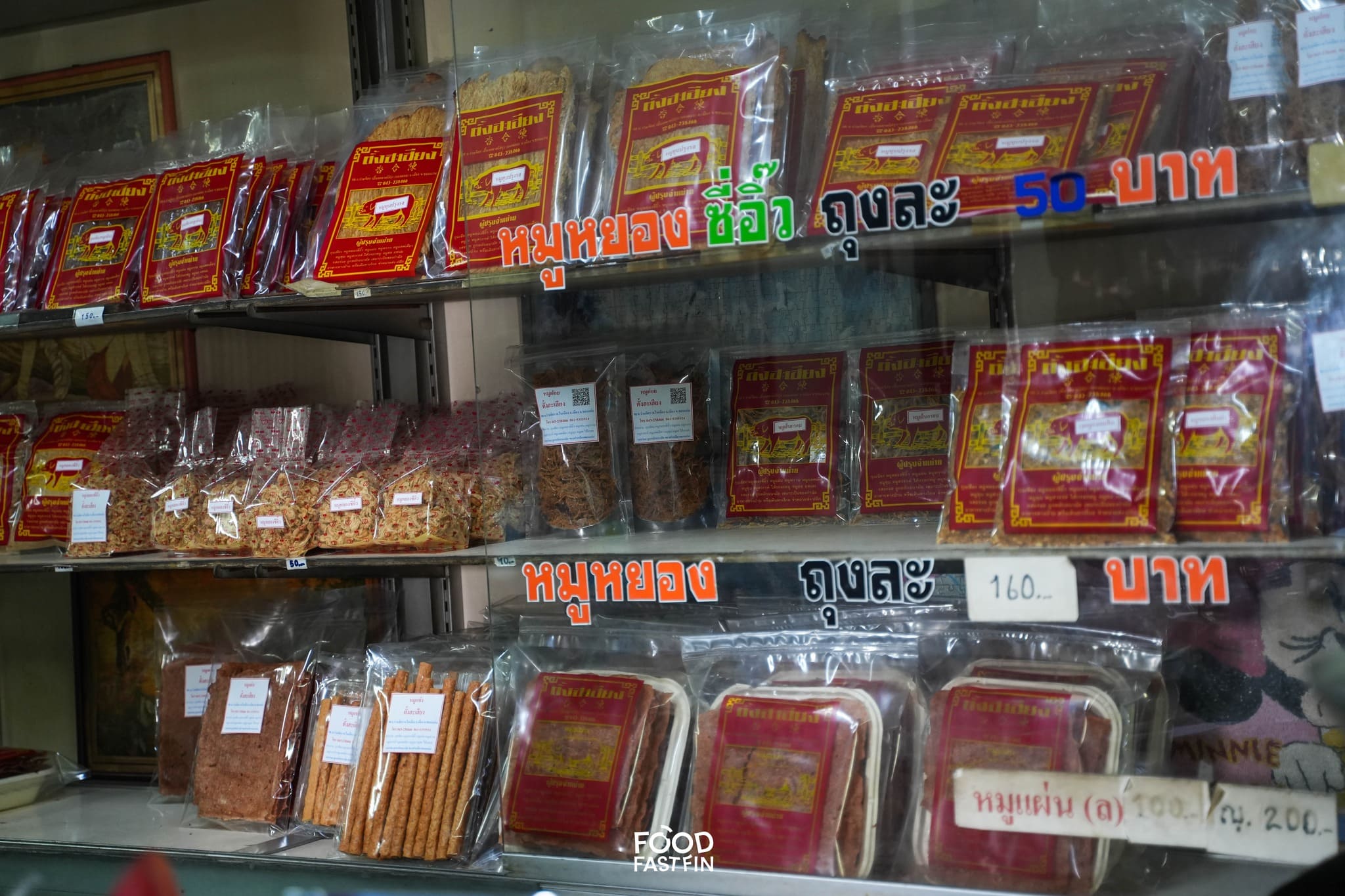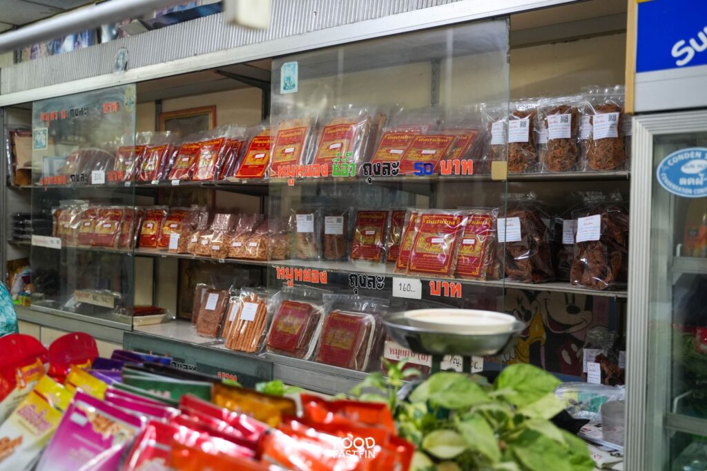 แม้ชื่อจะดังด้วย “หมูแผ่น” แต่หน้าตู้ไม่ได้มีดีแค่อย่างเดียว ใครชอบแนวคลาสสิกยังเลือกได้ตั้งแต่หมูหวาน หมูหยอง หมูทุบ หมูสวรรค์ หมูแดดเดียว ไปจนถึงกุนเชียง และขนมของฝากอีกหลายอย่าง เหมาะกับคนที่อยากได้ของฝากหลากหลาย ครบจบในที่เดียว แวะครั้งเดียวได้ของเต็มถุงทั้งกินเองและฝากคนที่บ้าน