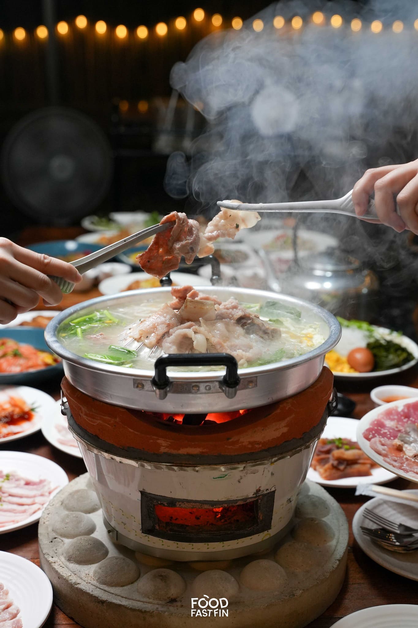 เมนูหมูกระทะ เสิร์ฟเป็นชุด ชุดละ 179 บาท มีทั้งหมูสามชั้นสไลด์ สันคอ หมูหมัก ตับหมู ตับหวาน ไข่แดง ผักสดรวม และทีเด็ดน้ำจิ้ม 2 แบบ น้ำจิ้มสุกี้ และ น้ำจิ้มตาแป๋ว รสชาติหวานนำ แซ่บเบาๆ