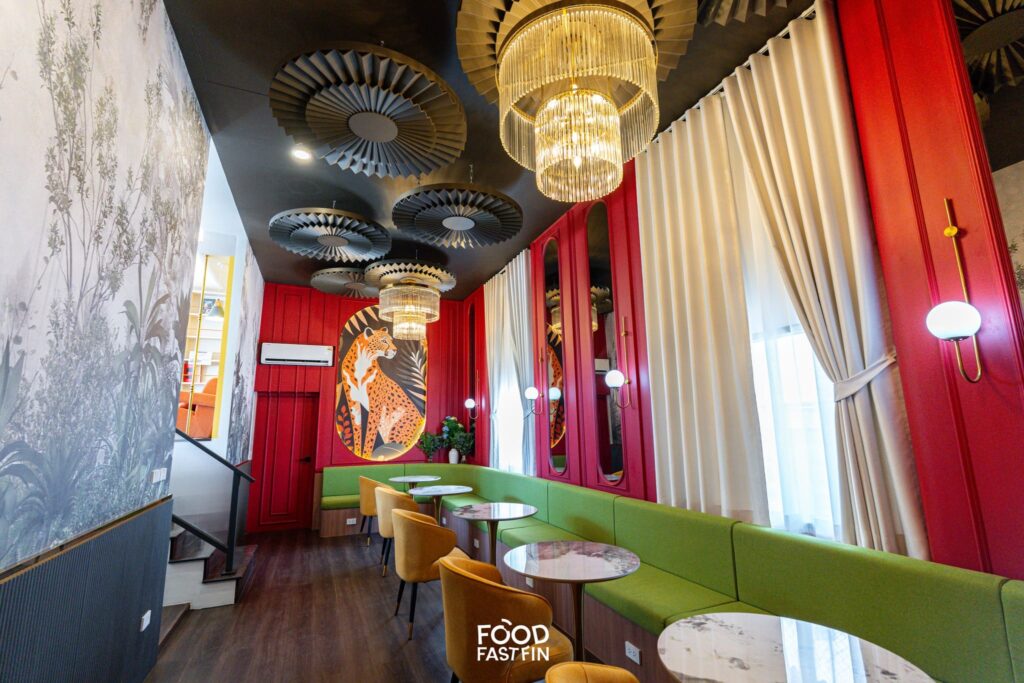 ต้องยกให้ “ห้องลับ” หลังประตูสีแดง เปิดเข้าไปคือว้าวเลย อีกโซนมาในฟีลหรูเท่ ผนังแดงตัดกับโซฟาเขียว เก๋แบบมีสไตล์ แถมยังมีชั้นลอยให้ฟีลเหมือนห้องนั่งเล่น จะมานั่งชิล ทำงาน หรือหยิบหนังสือมาอ่านก็ลงตัวสุดๆ และเมนูที่เฮียอยากจะแนะนำนั่นก็คือ ครัวซองต์สตรอว์เบอร์รี่ครีมนมสดกับ 1st Love Croissant นอกจากของหวานแล้วยังมี Ice Tiramisu ที่เฮียอยากให้ลอง